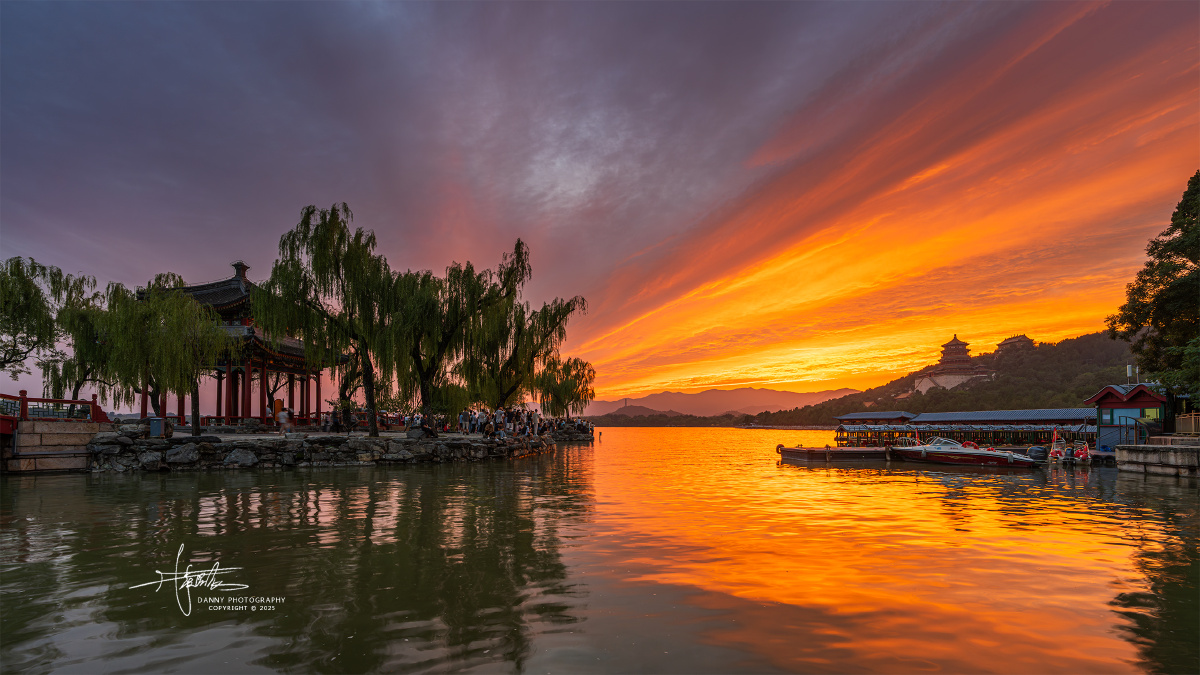 今年夏季难得的一场火烧云,吸引了广大摄影爱好者前来拍照留念,灿烂的霞光染红了昆明湖,仿佛油画般的浓郁色彩。