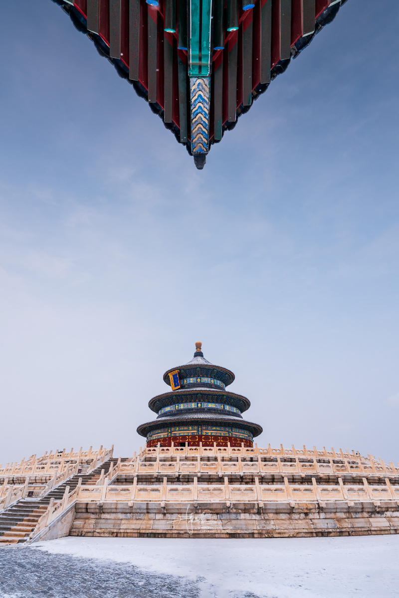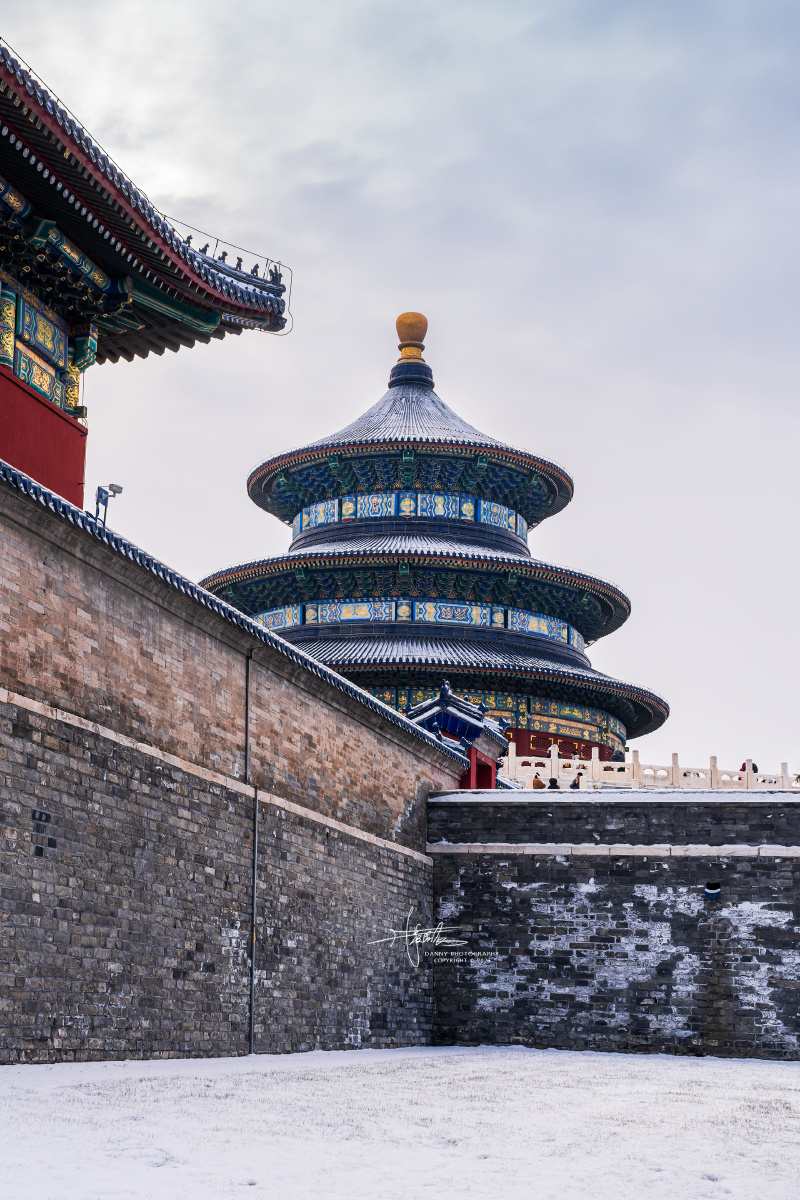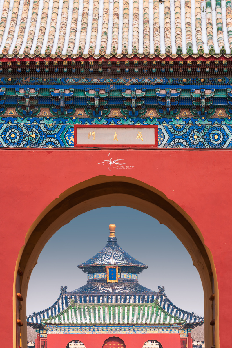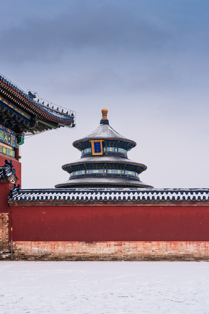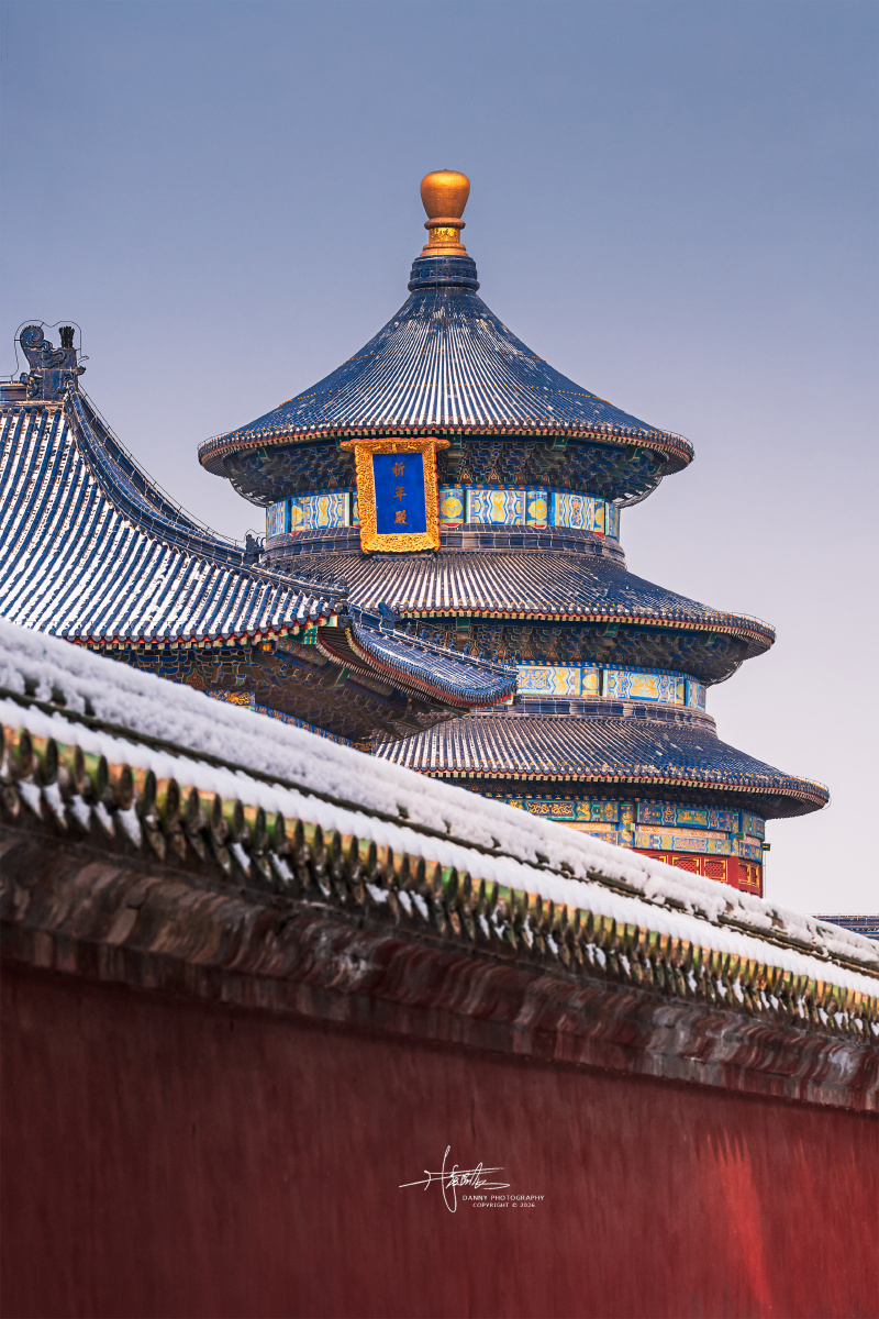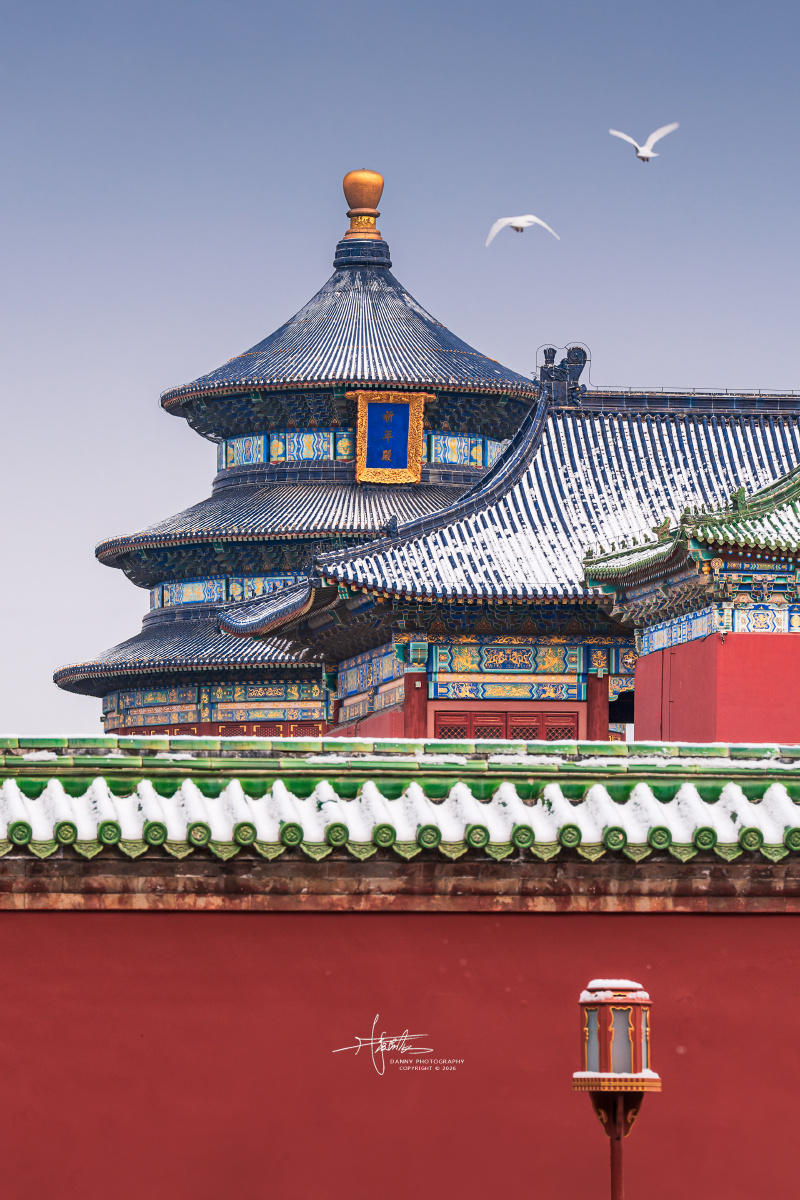 红墙嵌白玉,飞雪落琼台。六百年祈年殿肩披鹤氅,银装素裹,静听雪落回音。 纪念2026年北京初雪。